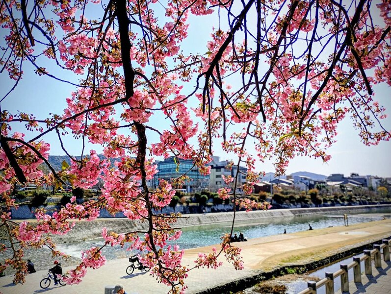 河津桜(カワヅザクラ)はソメイヨシノよりも開花時期が早く、色の濃いピンク色の花を咲かせるのが特徴ですが、この場所は京の中心部で春を告げる代表的なスポットの一つです。